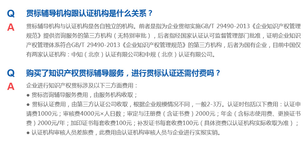 A.貫標(biāo)輔導(dǎo)機(jī)構(gòu)與認(rèn)證機(jī)構(gòu)是各自獨(dú)立的機(jī)構(gòu)。前者是指為企業(yè)貫徹實(shí)施GB/T 29490-2013《企業(yè)知識(shí)產(chǎn)權(quán)管理規(guī)范》提供咨詢服務(wù)的第三方機(jī)構(gòu)(無(wú)特別審批),后者指指經(jīng)國(guó)家認(rèn)證認(rèn)可監(jiān)督管理部門批準(zhǔn),證明企業(yè)知識(shí)產(chǎn)權(quán)管理體系符合GB/T 29490-2013《企業(yè)知識(shí)產(chǎn)權(quán)管理規(guī)范》的第三方機(jī)構(gòu)。后者一般為國(guó)有企業(yè)。目前中國(guó)僅有兩家認(rèn)證機(jī)構(gòu):中知(北京)認(rèn)證有限公司和中規(guī)(北京)有限公司。